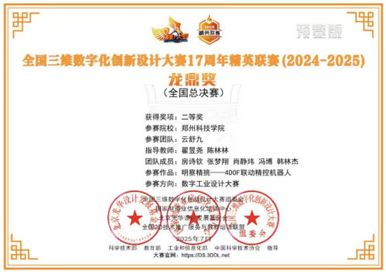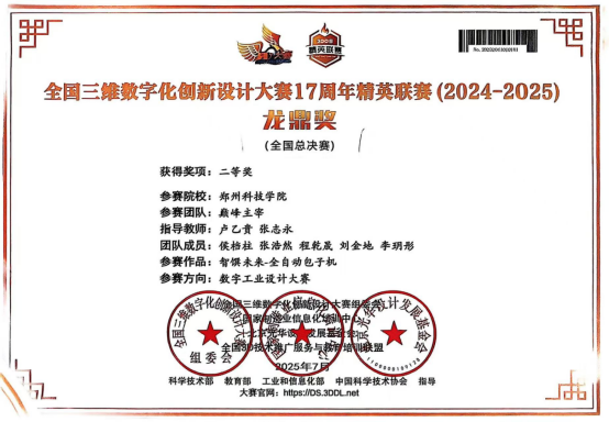 7月23日,全国三维数字化创新设计大赛(简称“全国3D大赛”)17周年精英联赛全国总决赛在西安落幕。郑州科技学院机械工程学院“巅峰主宰”“云舒九”两支团队经过激烈角逐,在比赛中脱颖而出,双双斩获总决赛二等奖。