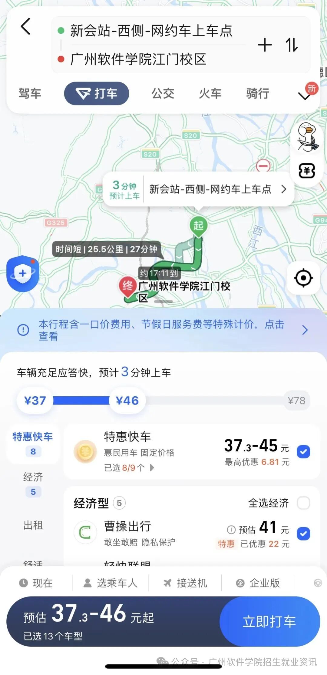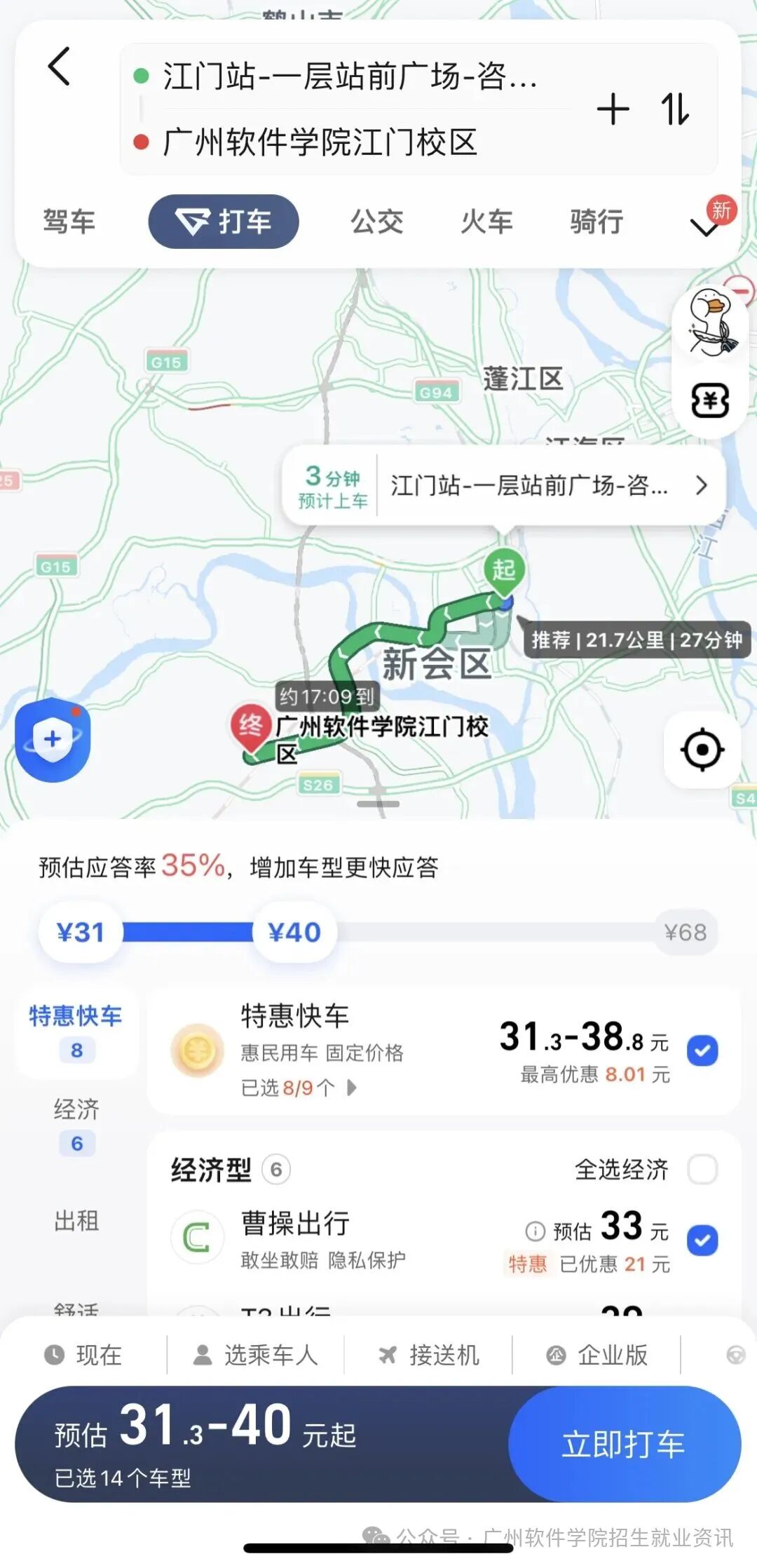 从江门其他高铁站打车前往广软江门校区,所需时间估计分别为:江门站约26分钟;新会站约30分钟;江门东站约37分钟。