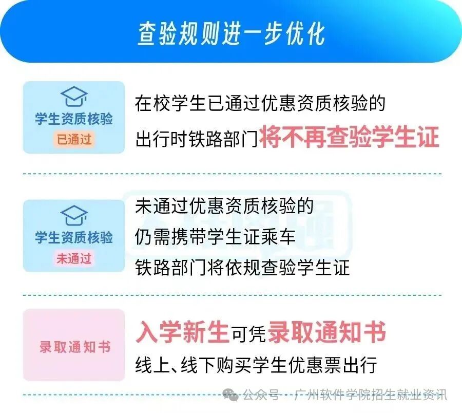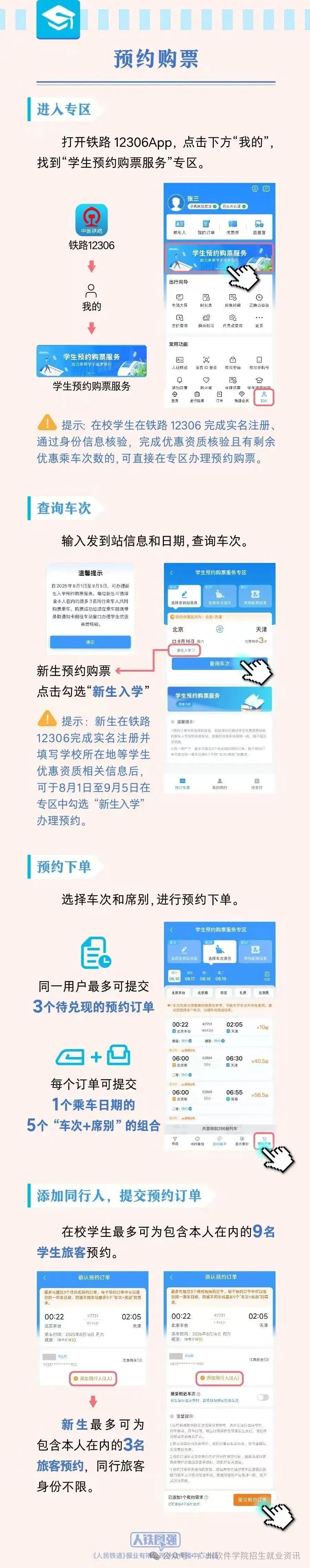 2025年8月1日起,铁路12306客户端开设“学生预约购票服务”专区,即将入学的新生,在铁路12306完成实名注册并填写学校所在地等学生优惠资质相关信息后,可于8月1日至9月5日在专区中勾选“新生入学”办理预约。在校学生在铁路12306完成实名注册、通过身份信息核验,完成优惠资质核验且有剩余优惠乘车次数的,可直接在专区办理预约购票。