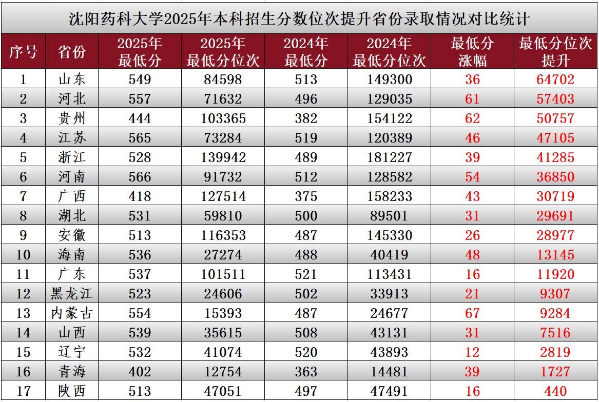 2025年,学校在17个省份的最低分数录取位次显著提升。相比于2024年,提升幅度最大的是山东省,最低分位次提升了64702位。此外,河北、贵州、江苏、浙江、河南、广西、湖北、安徽等省份,均实现了2万以上位次的显著提升。