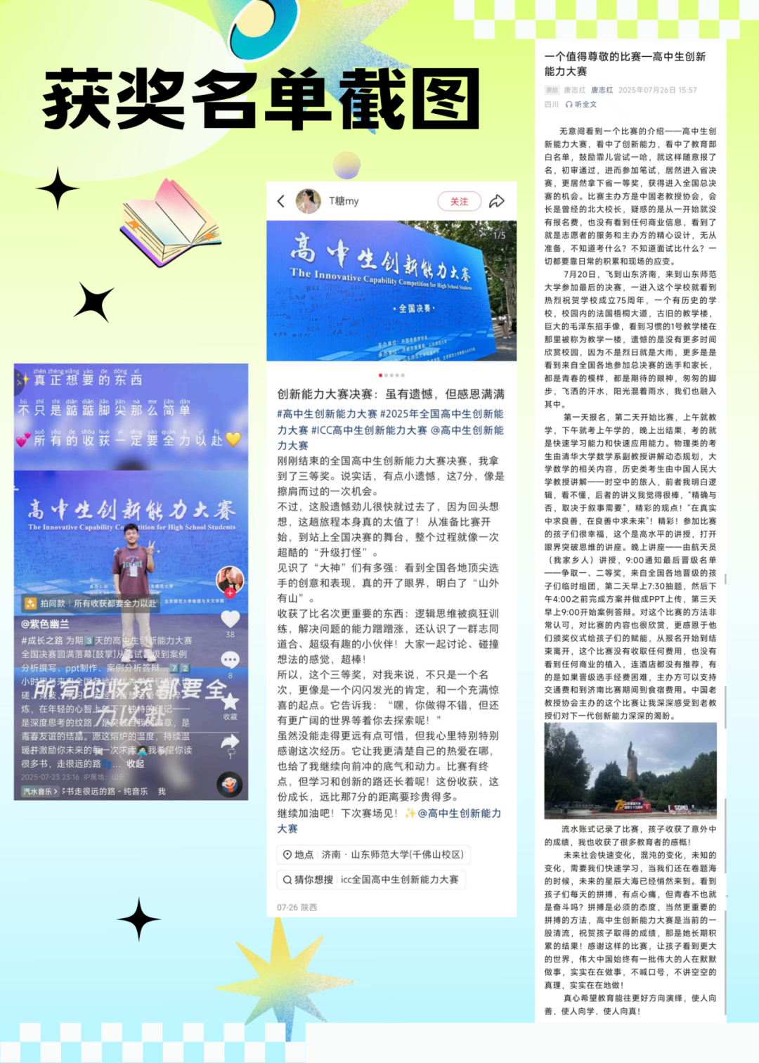 微信公众号平台的获奖者是一位来自四川成都的家长!下面是获奖的原文链接:一个值得尊敬的比赛—高中生创新能力大赛