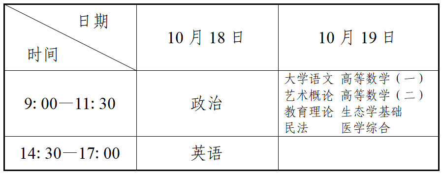 专升本各学科门类全国统考科目均为三门。两门公共课为政治、英语,一门专业基础课根据招生专业所隶属的学科门类确定(共分八类),考试科目为: