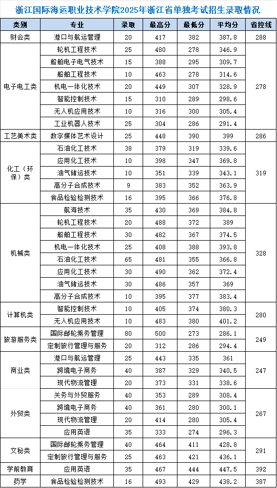浙江国际海运职业技术学院2025年浙江省单独考试招生录取分数