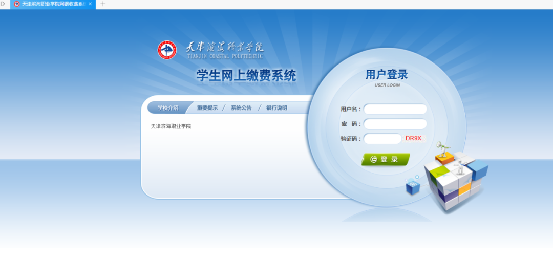 新生登录系统,用户名和密码均为学生考生号,输入验证码后,点击<登录>按钮,登陆系统。切记不要修改密码!微信缴费时不要截图扫描二维码,需借助电脑或另外一部手机扫描二维码方可缴费成功!