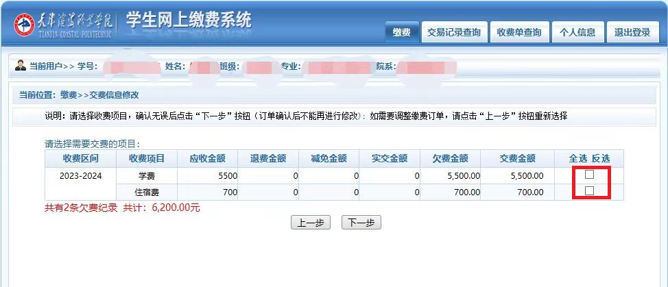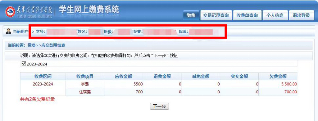 系统登陆后,会显示个人信息页面,如图所示。包括学号、姓名、院系、班级等信息。请在确认个人信息中的学号、姓名无误后再进行缴费。在缴费过程中请确保菜单栏下方的当前用户信息无误。点击【下一步】按钮,选择具体的缴费项目。