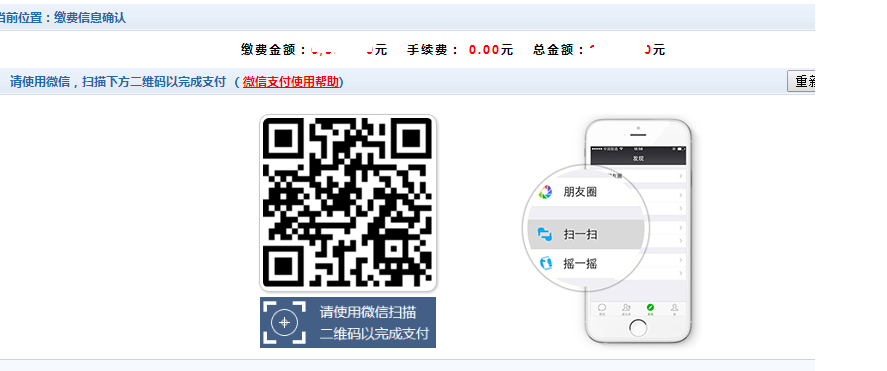 确定支付金额无误后,点击确定支付,进入如下图所示微信二维码扫描支付界面。