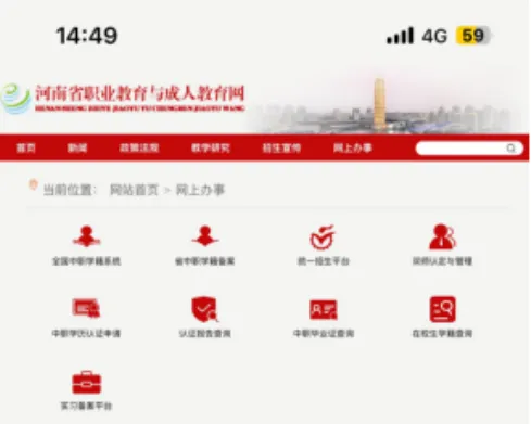 3.浏览器搜索“河南省职业教育与成人教育网”,点击首页“网上办事”栏,点击“统一招生平台”窗口;