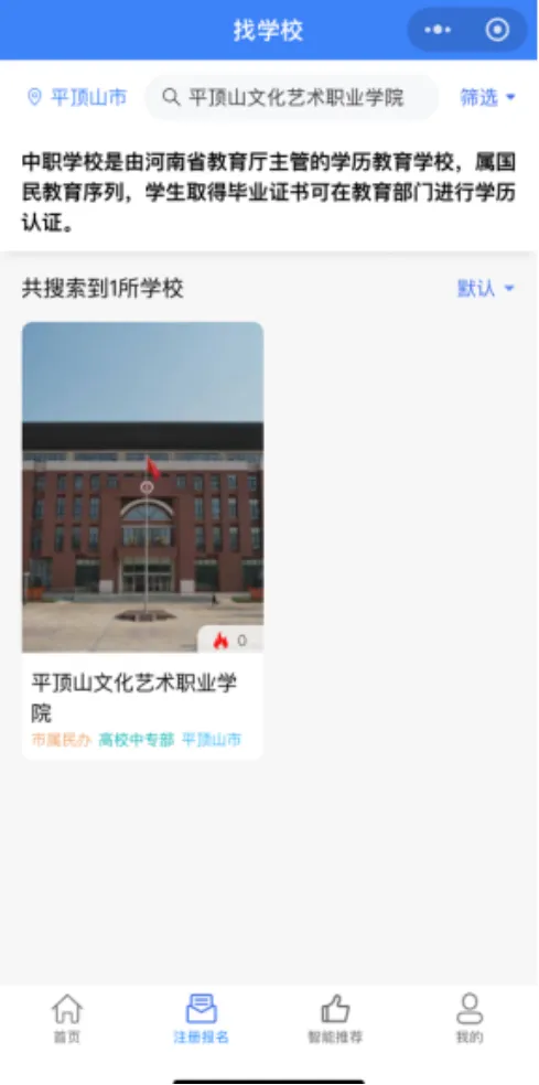 4.点击“查找学校”,搜索“平顶山文化艺术职业学院”。