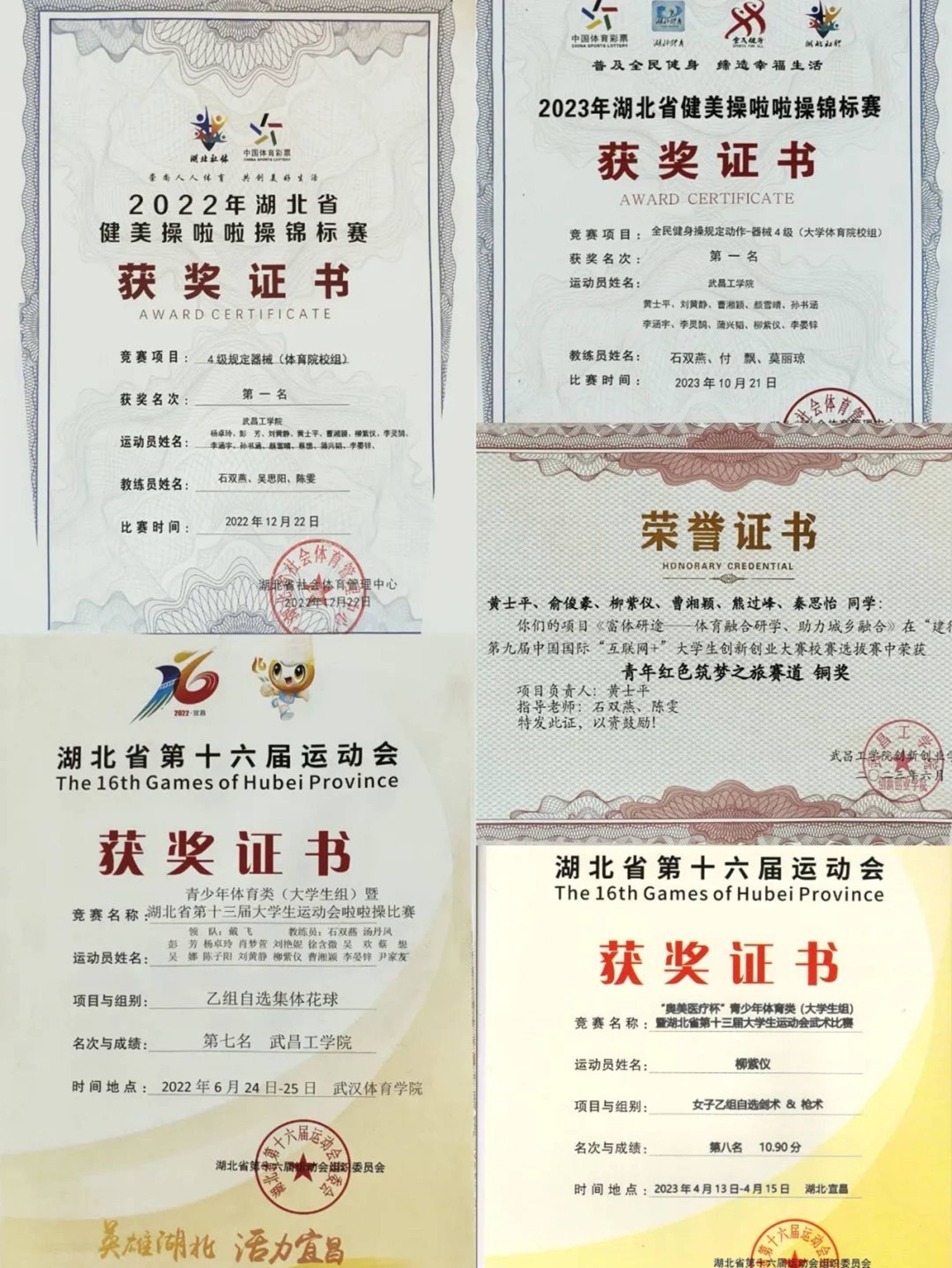 从学科竞赛的思维碰撞到体育赛场的拼搏进取,柳紫仪始终以积极向上的态度迎接每一次挑战,用努力和汗水书写着青春答卷。她组队参加湖北省第十三届“挑战杯”大学生创业计划竞赛,在项目筹备期间与团队成员反复打磨方案,最终凭借扎实的专业功底和创新思维荣获铜奖。在文体竞技方面,作为校健美操队的骨干成员,她与队友们在湖北省健美操(啦啦操)比赛中默契配合,以规范的动作和昂扬的精神面貌夺得第一名;在湖北省第十六届大学生运动会武术比赛中,她凭借长期坚持的武术训练功底,获得第七名……