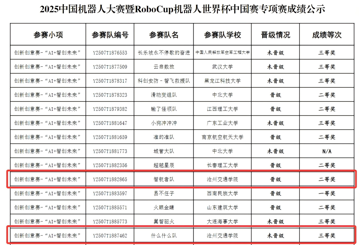 8月15-17日,由中国自动化学会、RoboCup中国委员会主办的2025中国机器人大赛暨RoboCup机器人世界杯中国赛——创新创意赛“AI+智创未来”赛项成功举办。我校电子与电气工程学院首次组队参加该项赛事,在本次竞赛中,选派的两支队伍与来自西北工业大学、东北大学、武汉大学等全国的150多所高校的200多支队伍同台竞技,分别荣获二等奖(晋级全国总决赛)和三等奖。