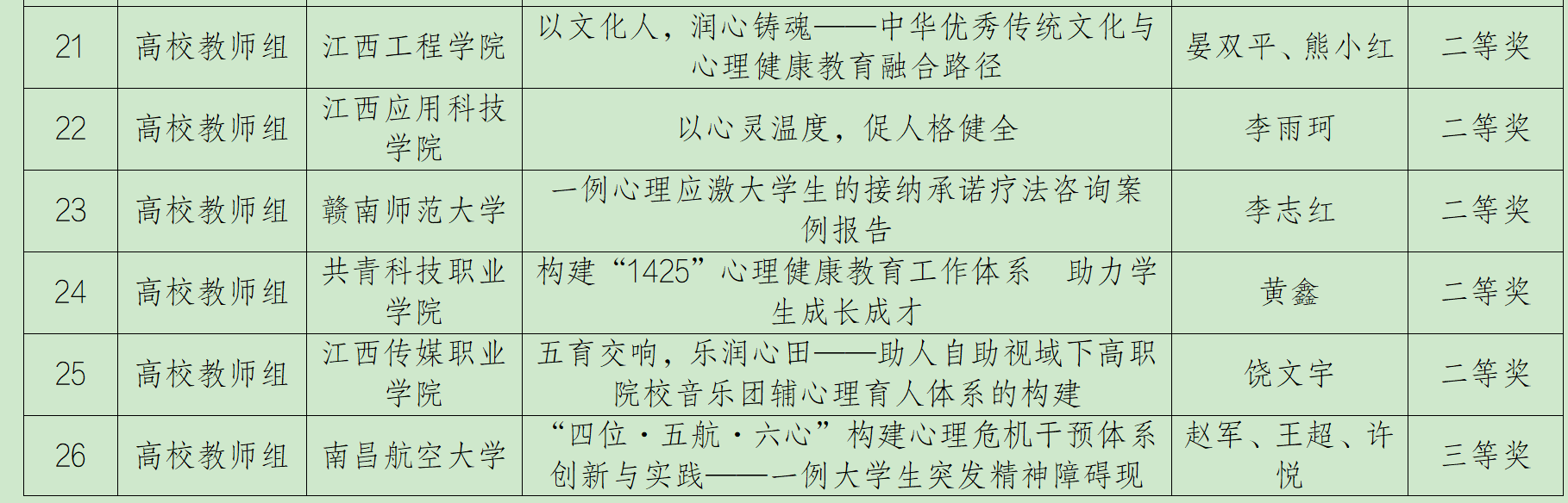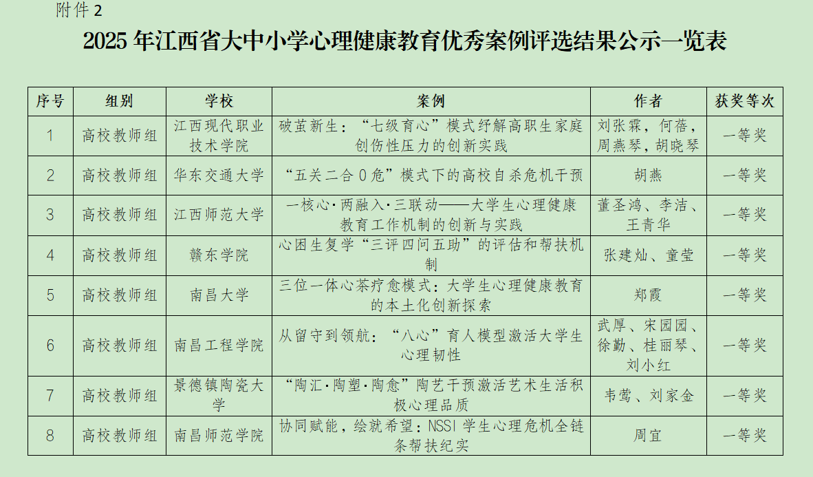 近日,江西省教育厅公布了2025年省大中小学“5·25”心理健康系列活动评选结果。在心理健康优秀案例评选活动中,经单位推荐、省外专家评审、现场决赛等环节,我校教师晏双平、熊小红的案例《以文化人,润心铸魂——中华优秀传统文化与心理健康教育融合路径》荣获高校教师组二等奖,为学校心理健康教育工作增添亮色。