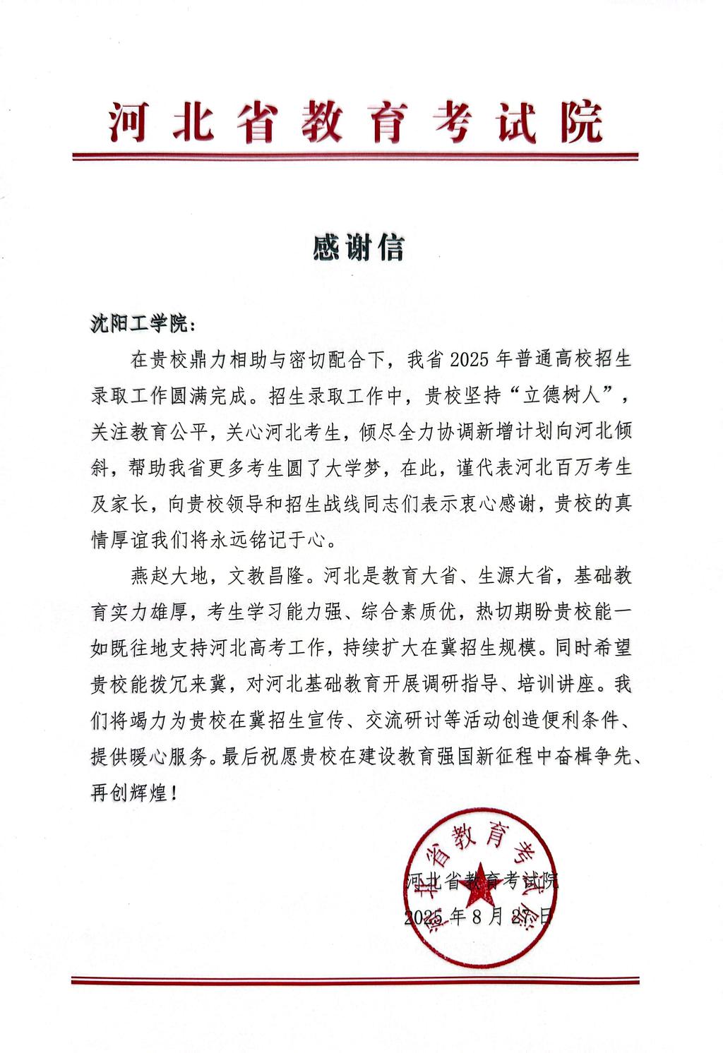 我校收到河北省教育考试院感谢信