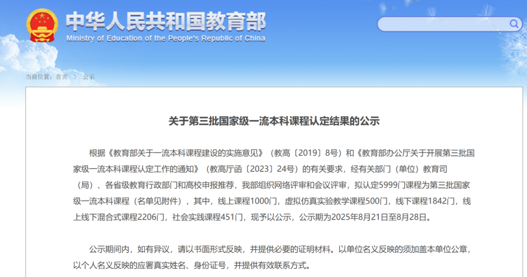 近日,教育部发布了《关于第三批国家级一流本科课程认定结果的公示》,拟认定5999门课程为第三批国家级一流本科课程。