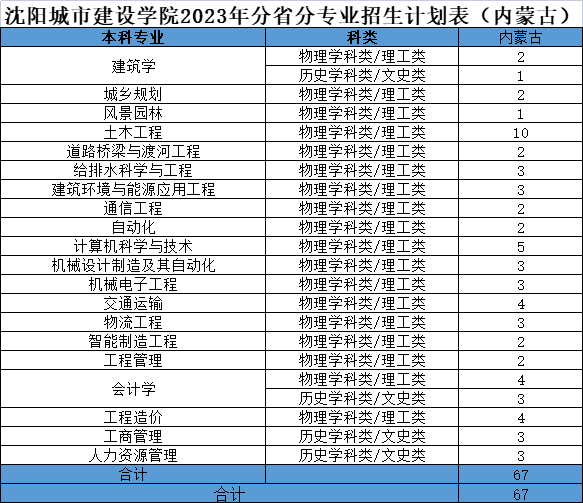 沈阳城市建设学院2023年分省分专业招生计划表(内蒙古)