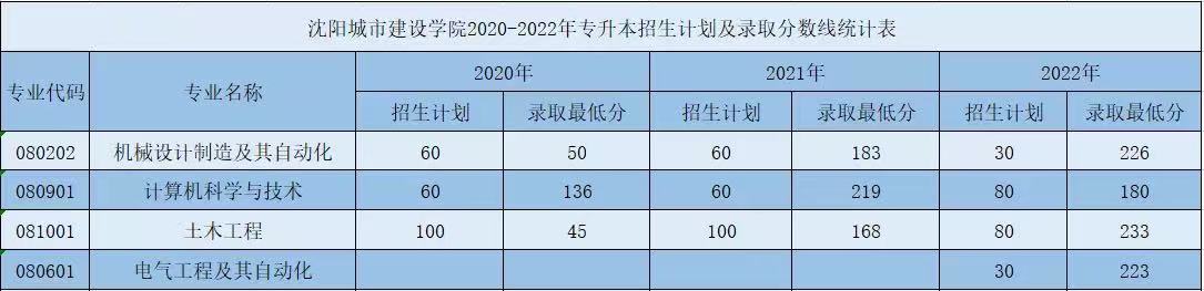 沈阳城市建设学院辽宁省2020-2022年专升本录取分数线统计表