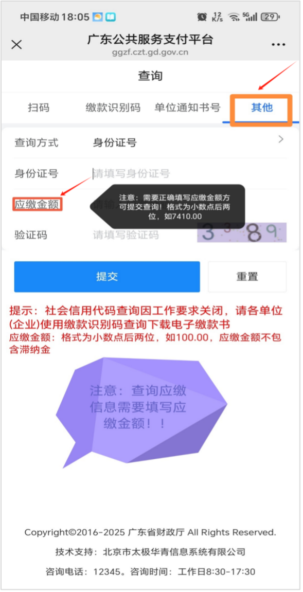 4.新的缴费查询页面如下:点击“其他”,正确输入身份证号、应缴金额、验证码,点击“提交”。