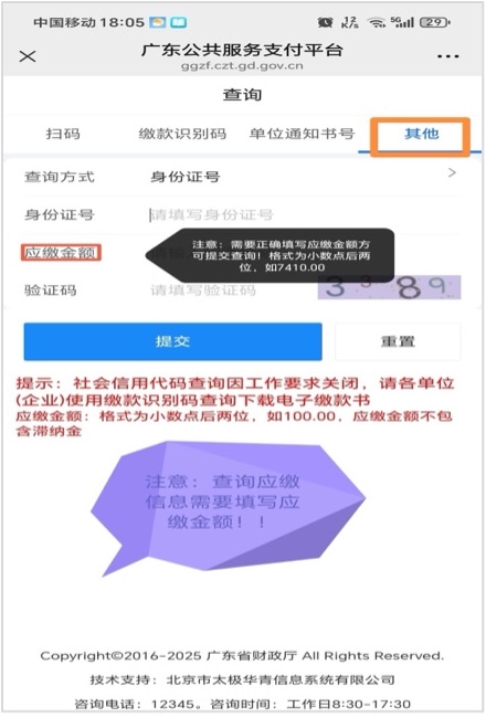 因广东省非税收入一体化平台系统优化,现查缴应缴信息时,在原基础上增加输入“应缴金额”查询项,缴款人必须正确填写方可查询待缴信息,请同学们留意!该查询项填写要求如下: