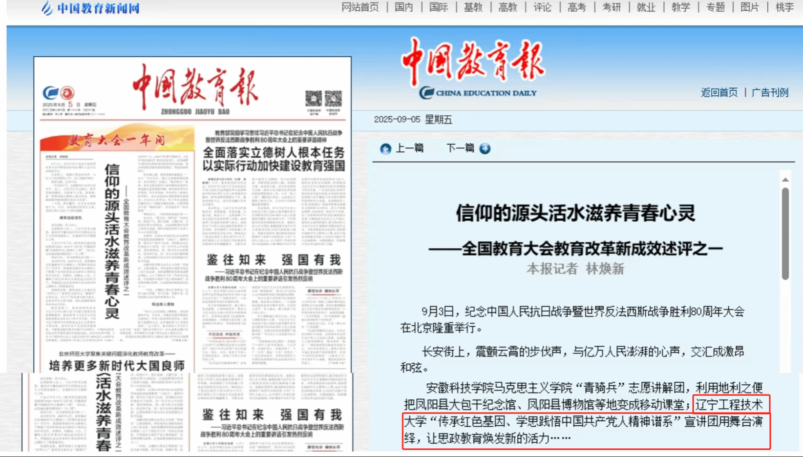 近日,值全国教育大会召开一周年之际,《中国教育报》于头版头条刊发了题为《信仰的源头活水滋养青春心灵——全国教育大会教育改革新成效述评之一》的深度报道。报道特别提及辽宁工程技术大学“传承红色基因、学思践悟中国共产党人精神谱系”宣讲团以舞台演绎的方式,赋予思政教育全新活力。此案例是辽宁工程技术大学落实立德树人根本任务,贯彻落实全国教育大会精神的创新举措。