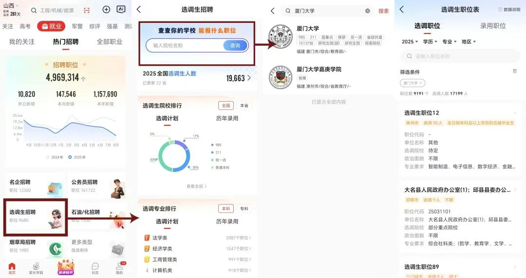 (1)查看目标院校能报考什么职业:优志愿app首页-就业专栏-热门招聘-选调生招聘-搜索栏输入院校名称;