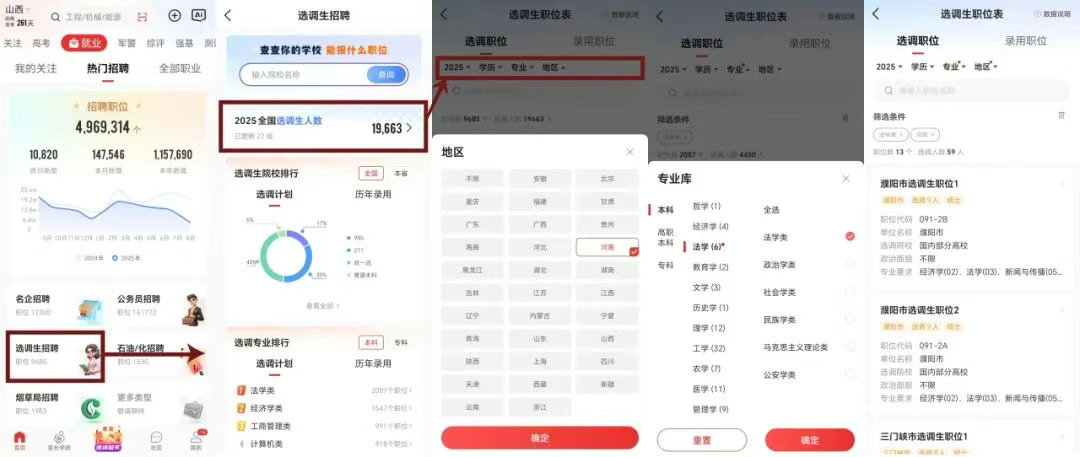 (2)查看所在省份的选调生招录情况:优志愿app首页-就业专栏-热门招聘-选调生招聘-2025全国选调生人数-筛选栏筛选地区、学历要求等。