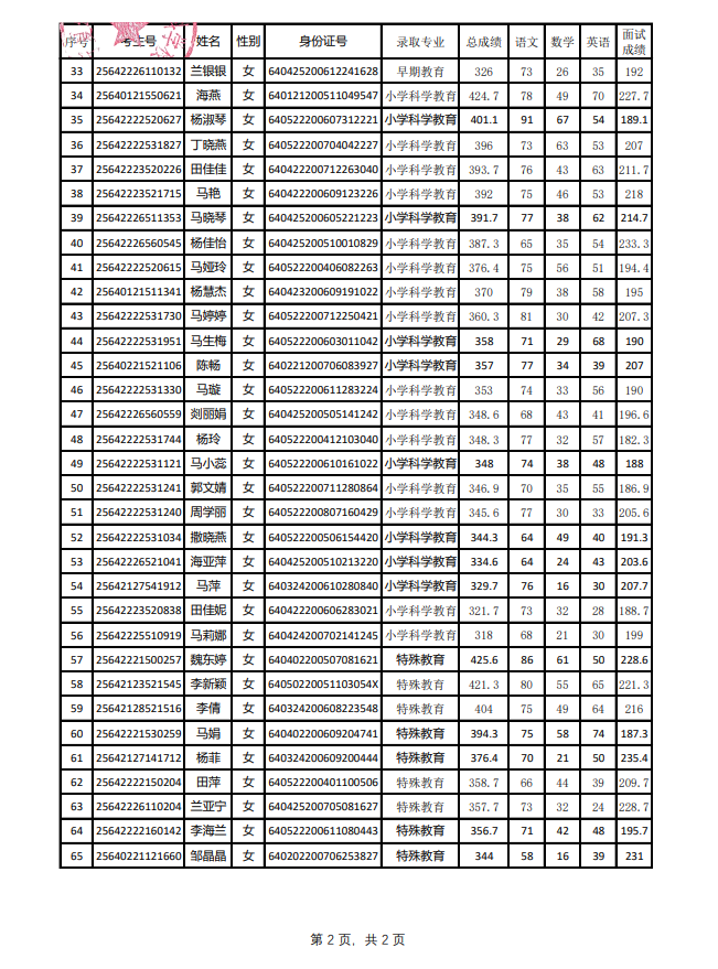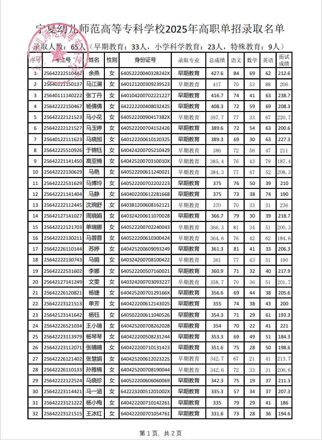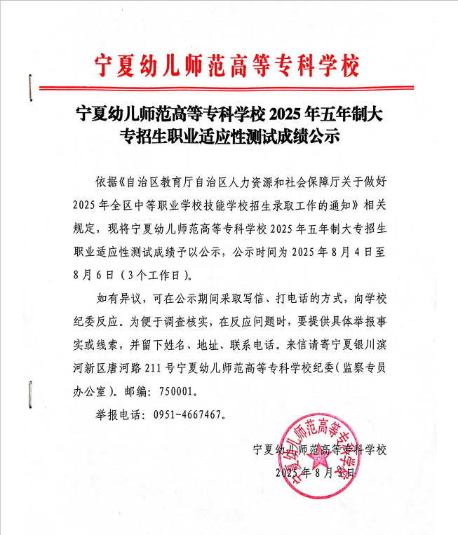 宁夏幼儿师范高等专科学校2025年高职单招职业适应性测试成绩及录取结果公示