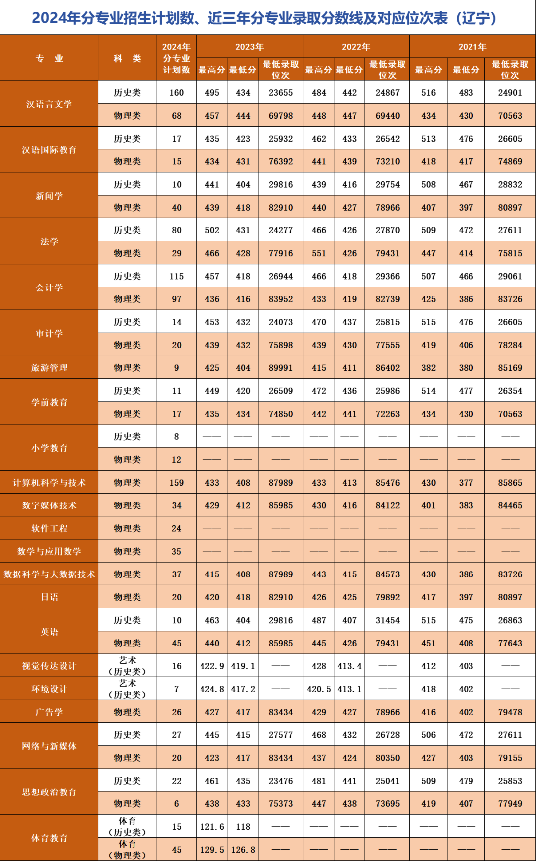 辽宁师范大学海华学院2024年招生计划分布