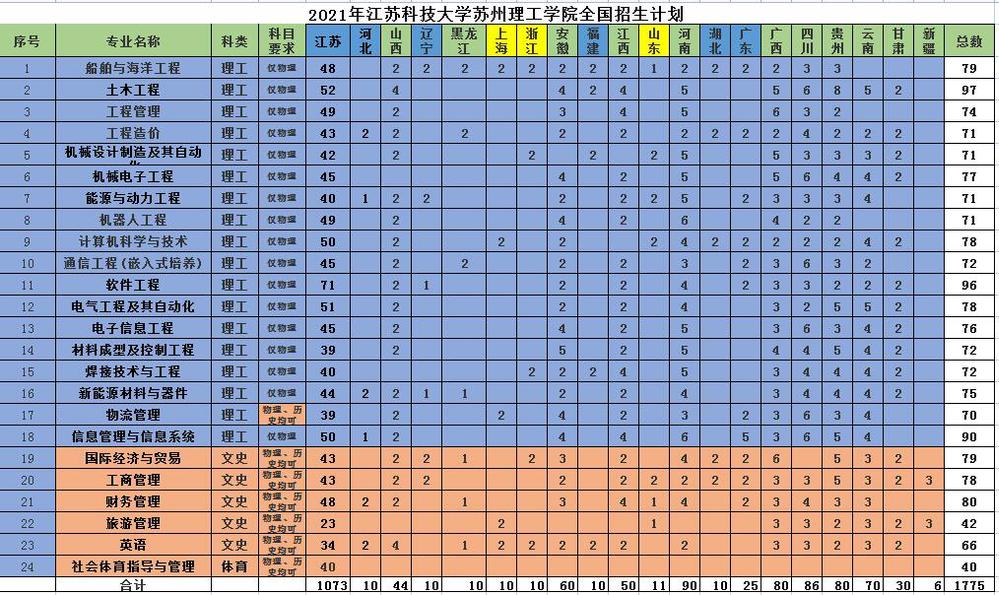 江苏科技大学苏州理工学院2021年全国招生计划表