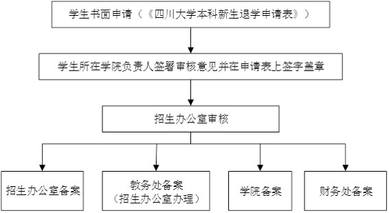 1.学生申请。学生提出退学申请后,填写《四川大学本科新生退学申请表》(本科招生网下载:https://zs.scu.edu.cn/)(一式四份);学生及家长签署意见,且在申请表后另附学生本人及其家长身份证复印件。