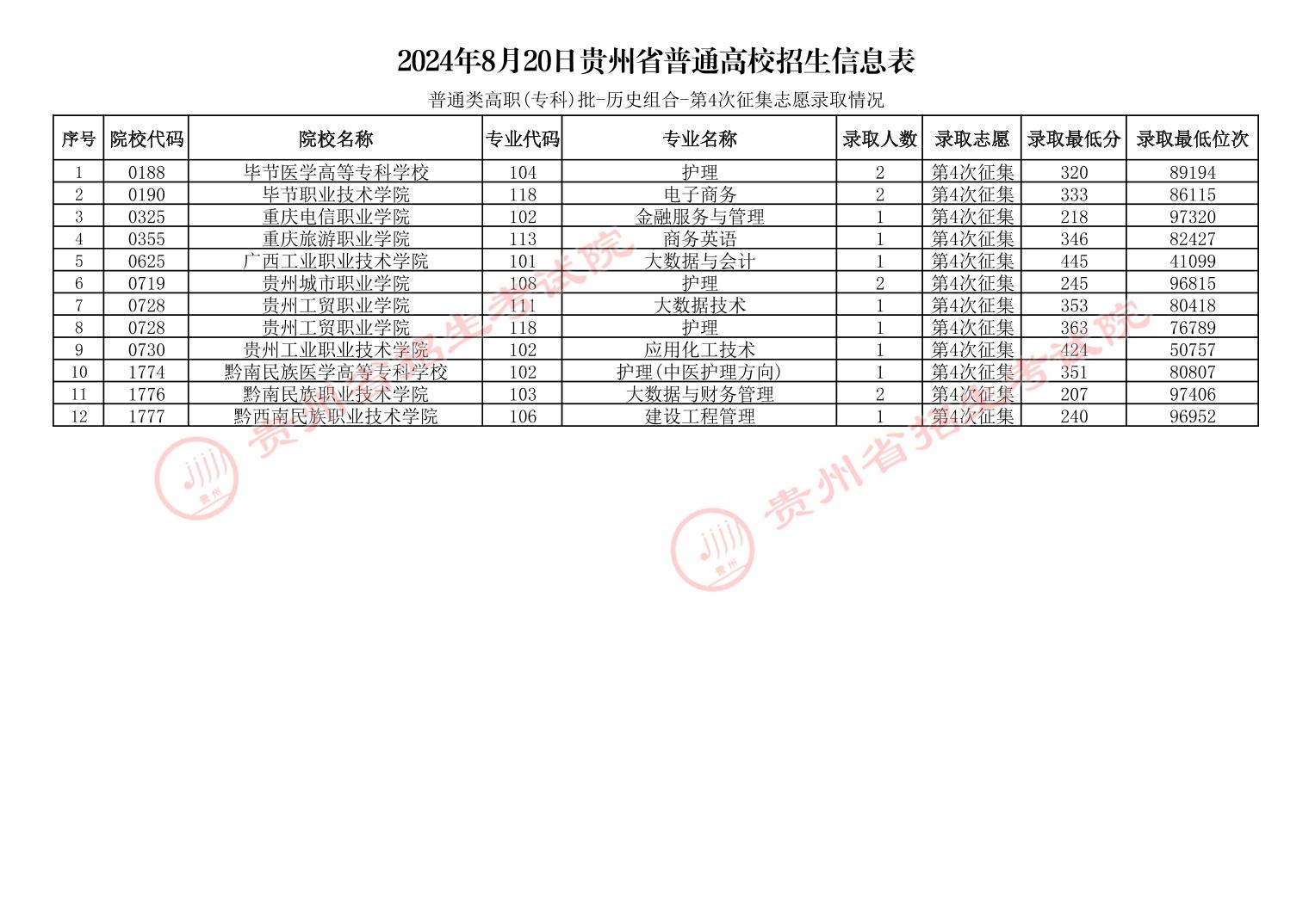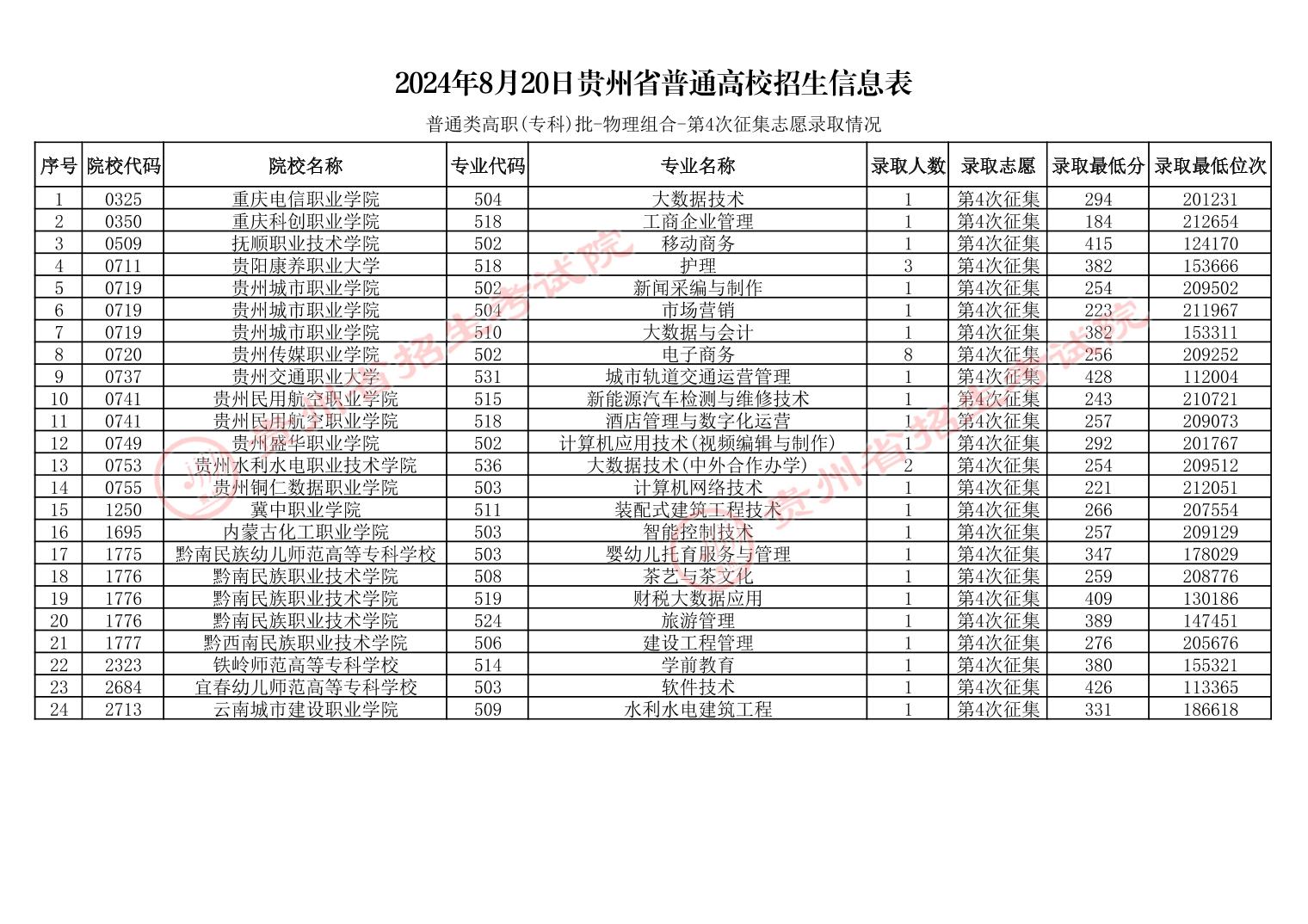 2024年8月20日贵州省普通高校招生信息表(普通类高职(专科)批-第4次征集志愿录取情况)
