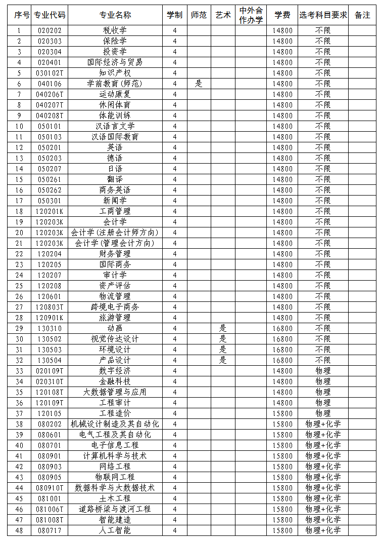 (一)学费:动画、视觉传达设计、环境设计、产品设计专业学费为16800元/生·年;土木工程、道路桥梁与渡河工程、智能建造、工程造价、电气工程及其自动化、电子信息工程、机械设计制造及其自动化、物联网工程、计算机科学与技术、网络工程、数据科学与大数据技术、人工智能专业学费为15800元/生·年;网络工程(中外合作办学)专业学费为36000元/生·年;其余专业学费为14800元/生·年。