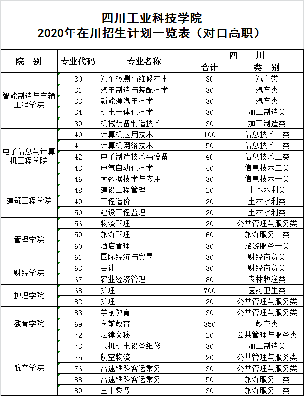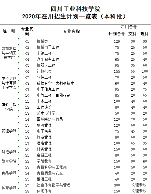 我校2020年在川招生专业及计划