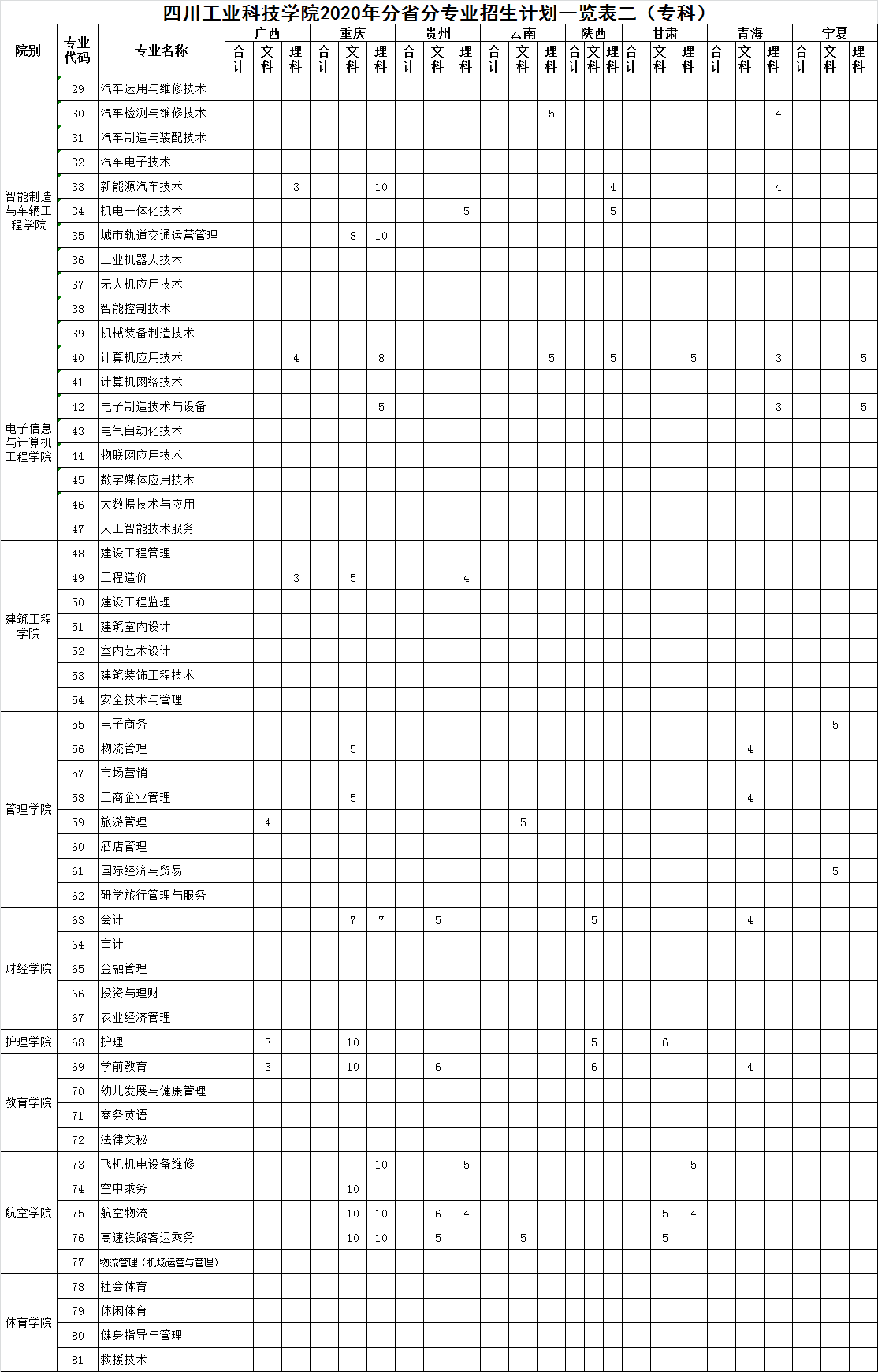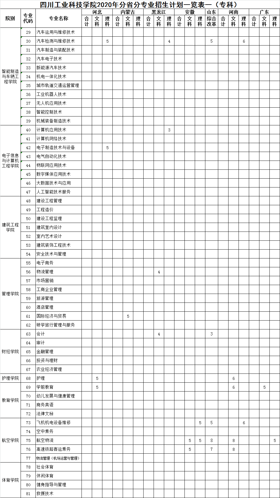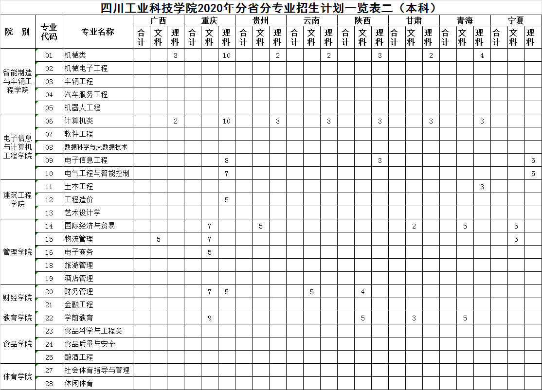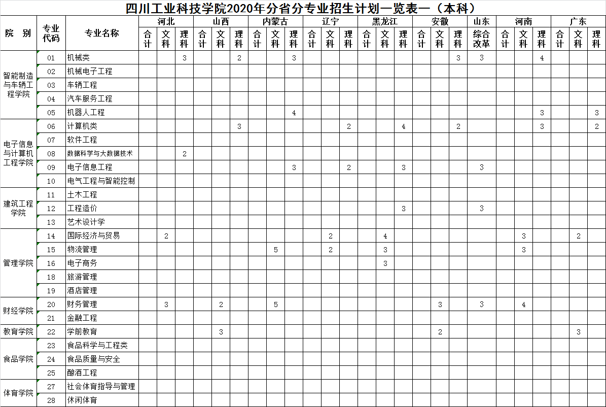 我校2020年分省招生专业及计划
