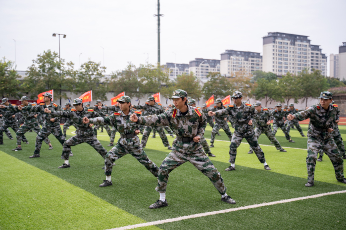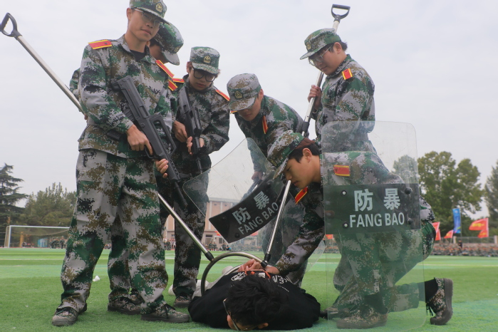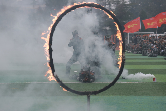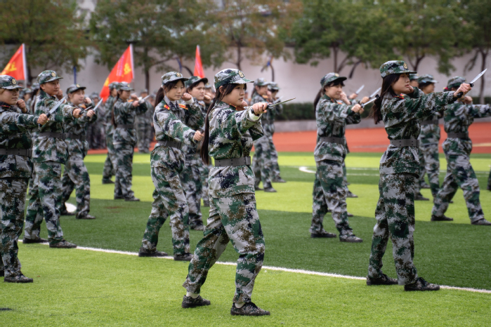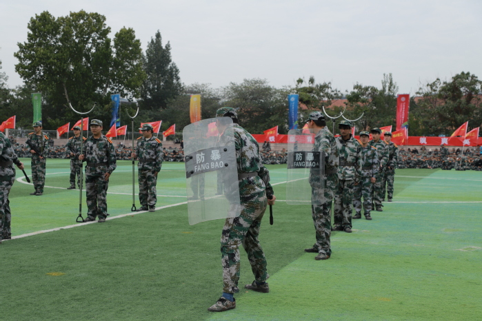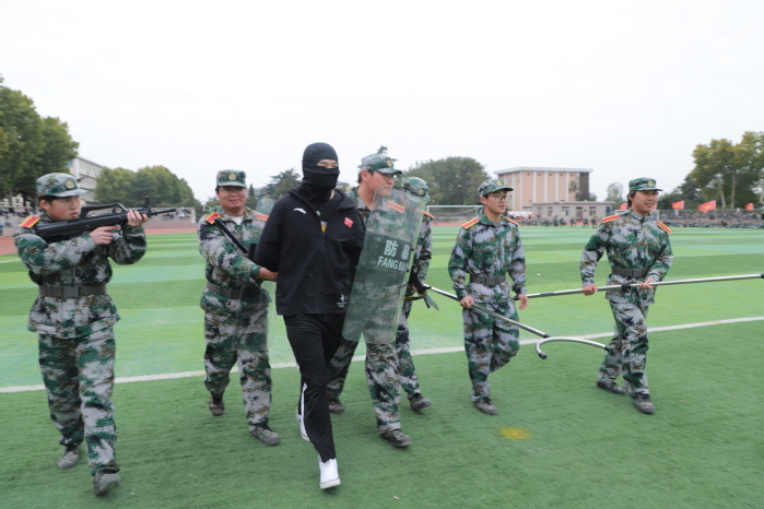 在军事科目表演环节,气势雄壮的刺杀操、刚劲有力的军体拳、英姿飒爽的匕首操、处置果断的校园反恐演练,一招一式尽显斗志昂扬,赢得全场师生的阵阵掌声。