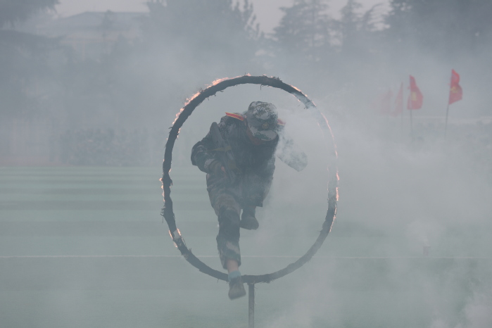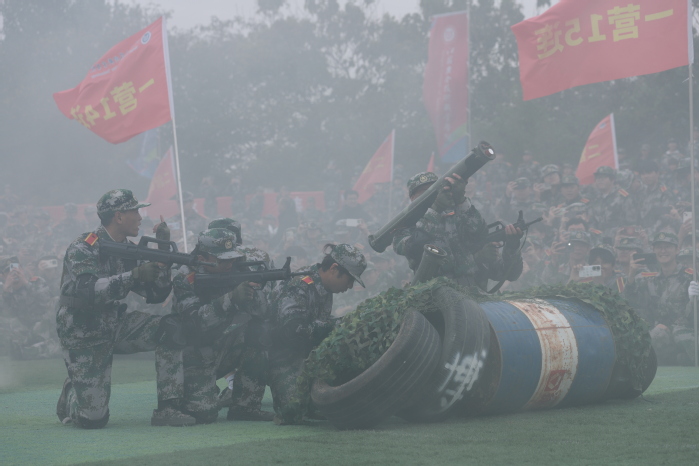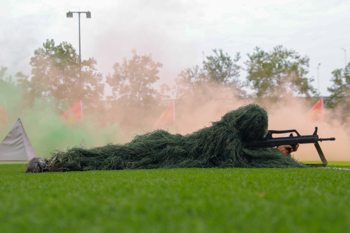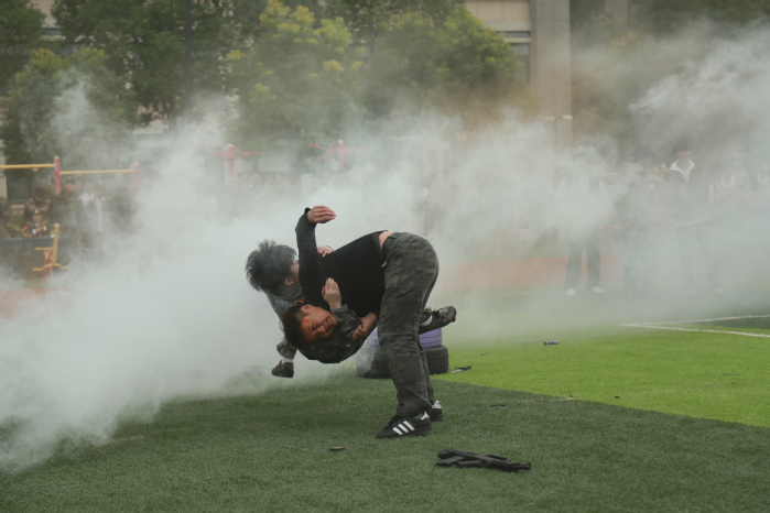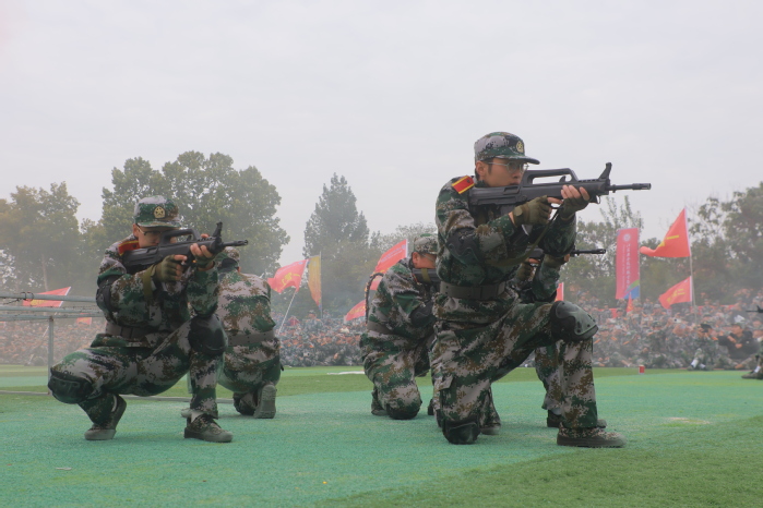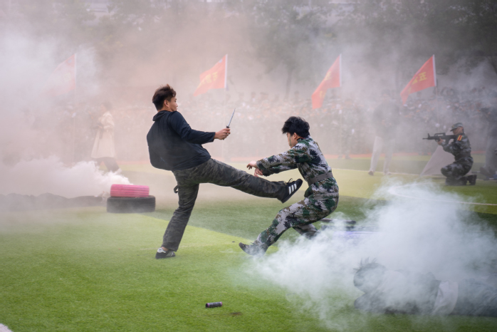 战术表演中,同学们运用战术队形进行作战演练,在模拟战场环境下进行接敌运动、搏斗杀敌、夺取阵地,将军训成果汇报表演推向高潮,充分展示了同学们良好的综合素质和朝气蓬勃、积极向上的精神风貌。