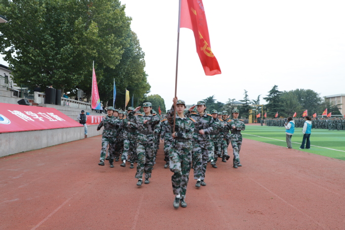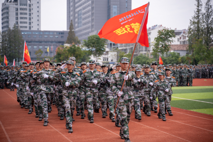 大会在雄壮的国歌声中拉开帷幕。各营连方阵依次走过主席台接受检阅,同学们步伐整齐、精神抖擞、口号响亮,动作规范有力,充分展现了军事训练所培养出的扎实素养与严谨作风。