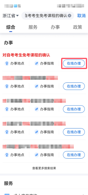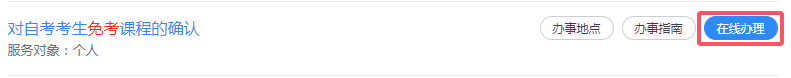 2.考生在浙江政务服务网搜索“免考”进行“在线办理”;通过浙江省教育考试院官网或浙江自学考试信息网直接链接浙江政务服务网“在线办理”界面。