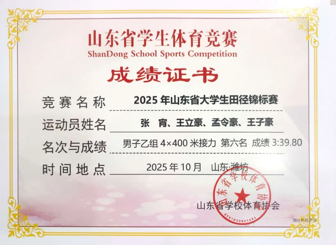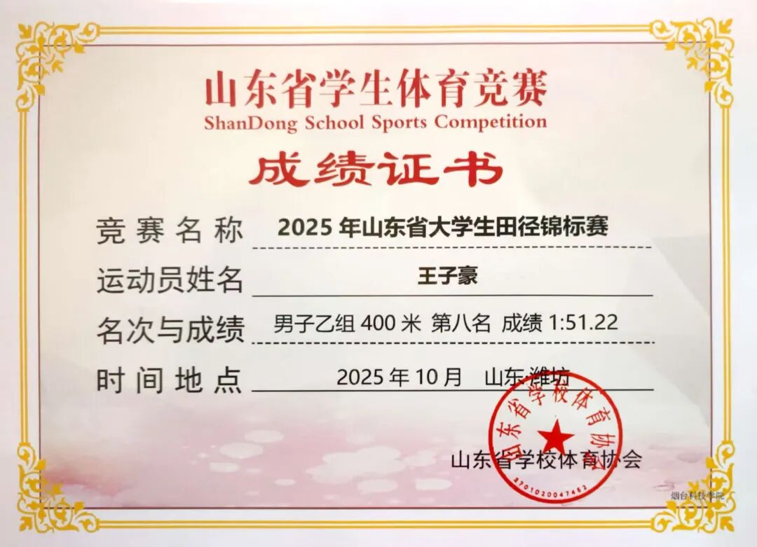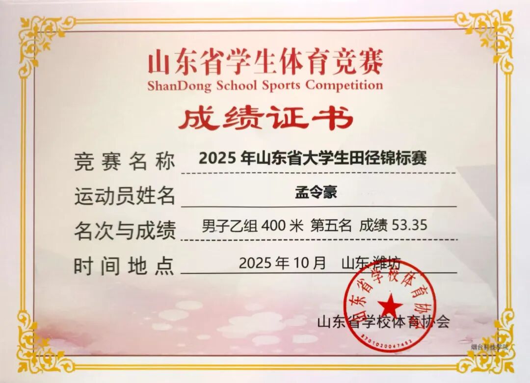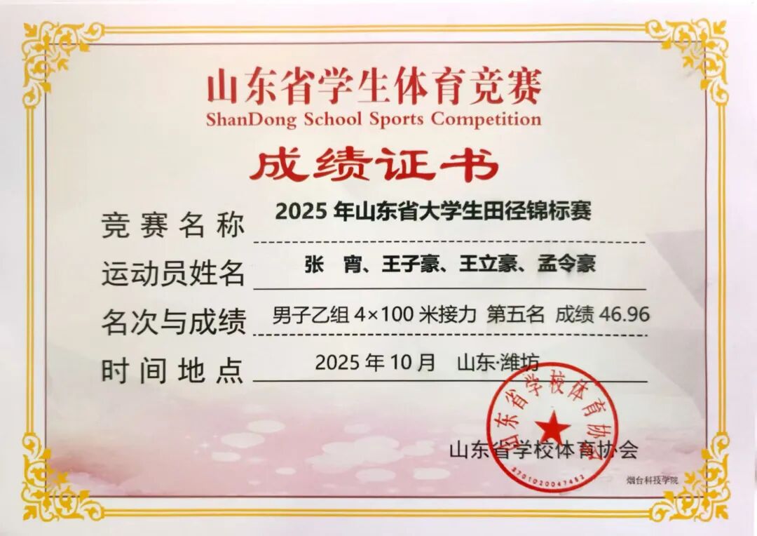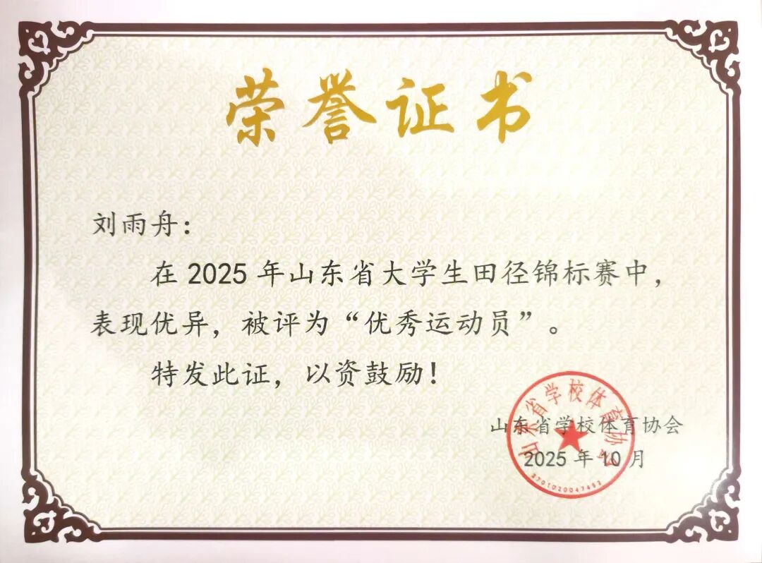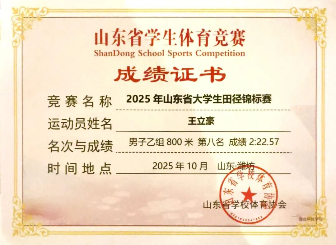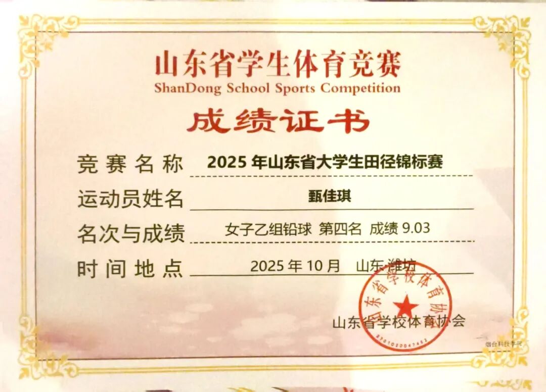 金秋十月,硕果盈枝。2025年10月8号-14号,山东省大学生田径锦标赛在潍坊市奥林匹克体育中心举办,全省69所高校,700余名运动员同台竞技,我校八位运动健儿再创佳绩绽锋芒,凭借平日刻苦训练的扎实功底与赛场上奋勇拼搏的顽强精神,在激烈的角逐中突破自我,最终斩获多项佳绩。