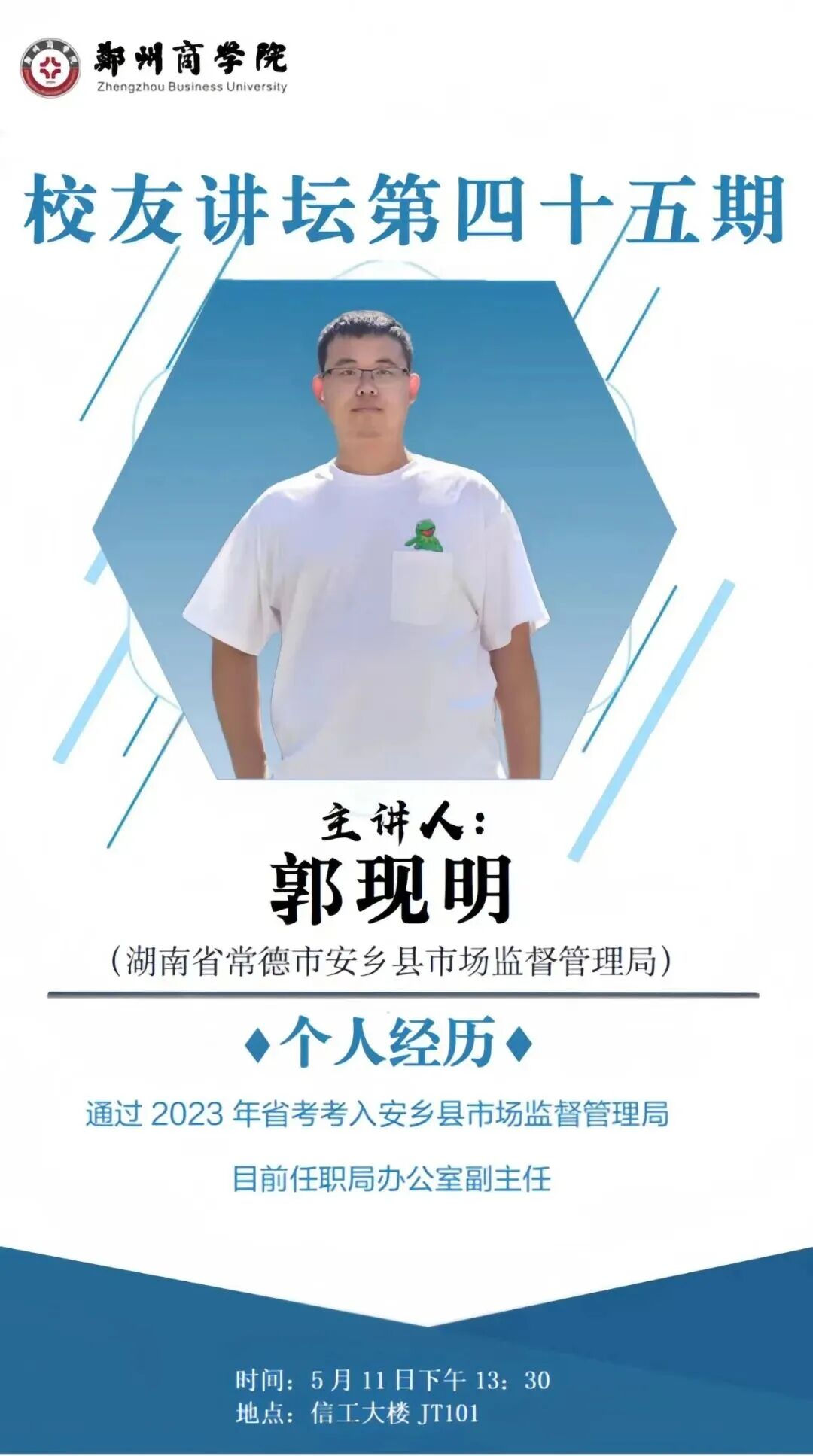 为了促进知识传承与经验交流,增进校友间的情感联系,提升在校学生的职业素养与人生规划能力,2025年5月11日下午,由招生就业处主办,机电学院承办的郑州商学院校友讲坛第四十五期开讲。本次讲坛特邀我校2018届电子信息工程专业毕业生、现任安乡县市场监督管理局办公室副主任郭现明担任主讲嘉宾。