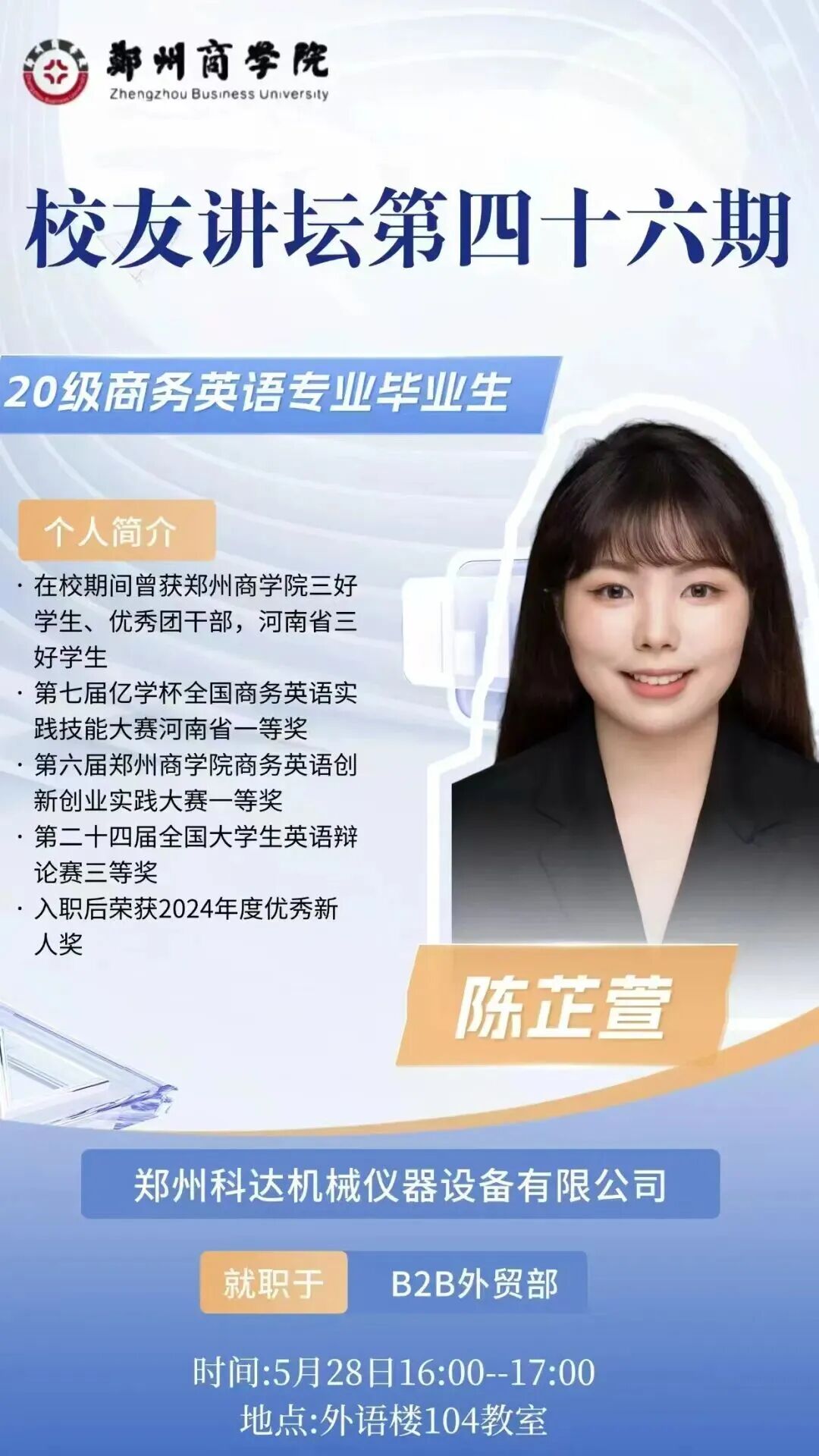 为助力在校学生提升职业素养,做好人生规划,促进校友间知识与经验交流,5月28日,由招生就业处、外国语学院承办的郑州商学院校友讲坛第四十六期开讲。本次讲坛特邀2020届商务英语专业毕业生陈芷萱校友担任主讲嘉宾,与在校师生面对面交流,共话职业发展与成长之路,众多学生代表现场参与。