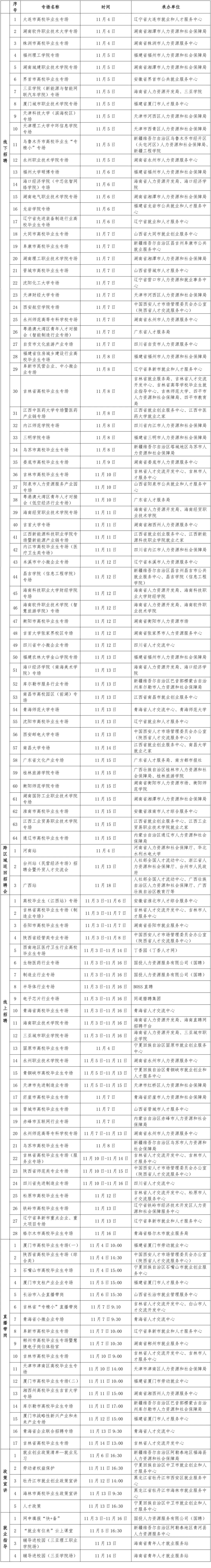 人力资源社会保障部职引未来——2025年全国城市联合招聘高校毕业生秋季专场推出第四批特色服务活动,包括92场面向先进制造、现代服务、医疗卫生、文化旅游等重点行业,以及西南地区、粤港澳大湾区等重点区域的线上线下专场(校园)招聘会,3场跨区域巡回招聘会,17场直播带岗活动和9场政策宣讲、就业指导直播(录播)课等,组织“专而精”“小而美”专项招聘,重点推进就业服务活动进校园,为高校毕业生提供有针对性的多元化就业服务支持。