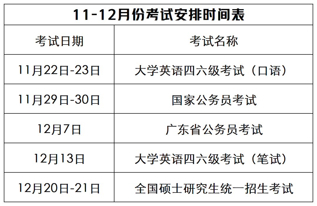 11-12月份考试安排时间表