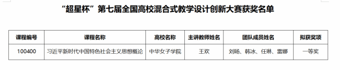 近日,“超星杯”第七届全国高校混合式教学设计创新大赛获奖公示名单揭晓。我校马克思主义学院院长王欢教授带领的教师团队凭借主讲课程《习近平新时代中国特色社会主义思想概论》在激烈角逐中脱颖而出,获得一等奖,实现了我校在该项全国性高水平赛事中的零突破,标志着我校在混合式教学改革与创新领域迈上了新的台阶。