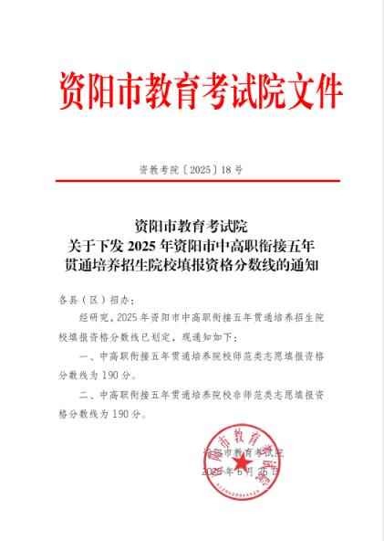2025年资阳市中高职衔接五年贯通培养招生院校填报资格分数: