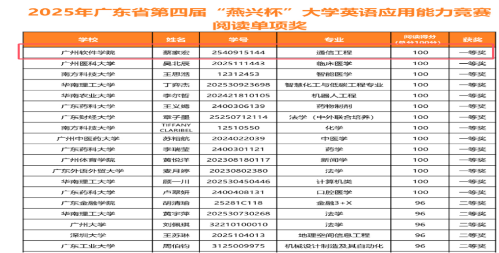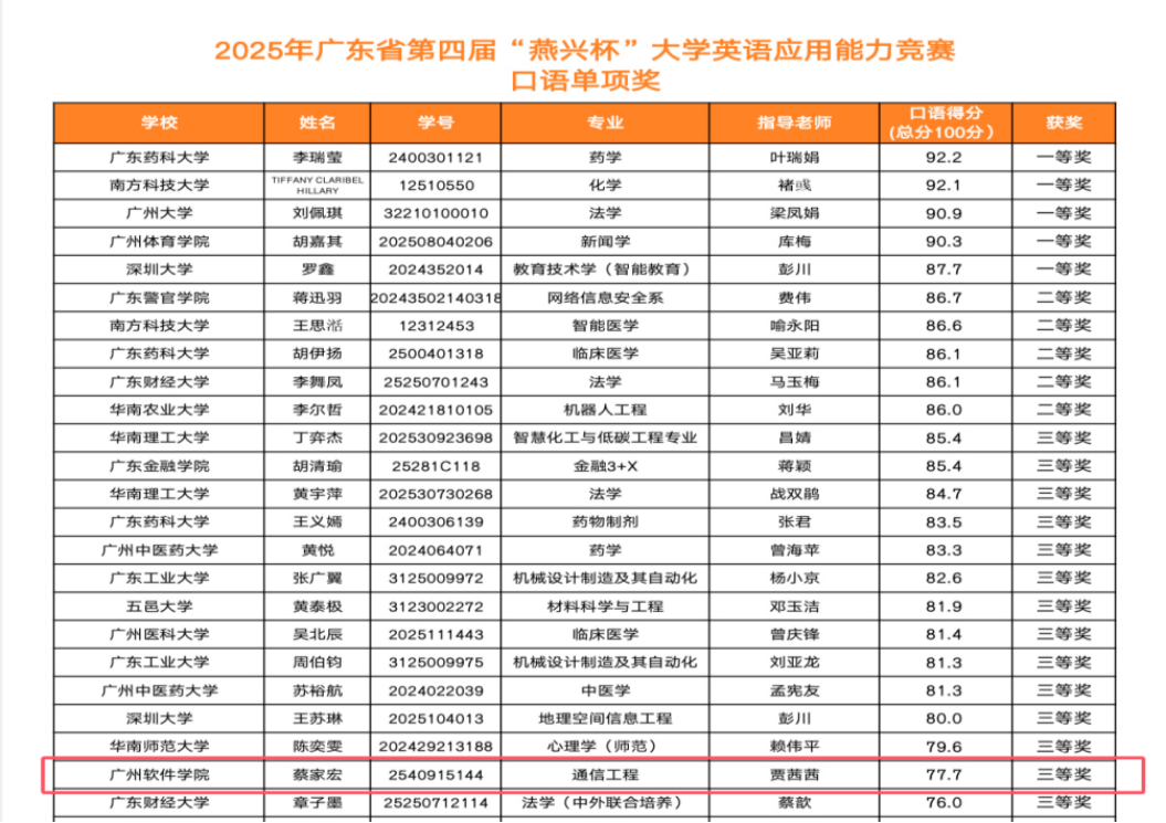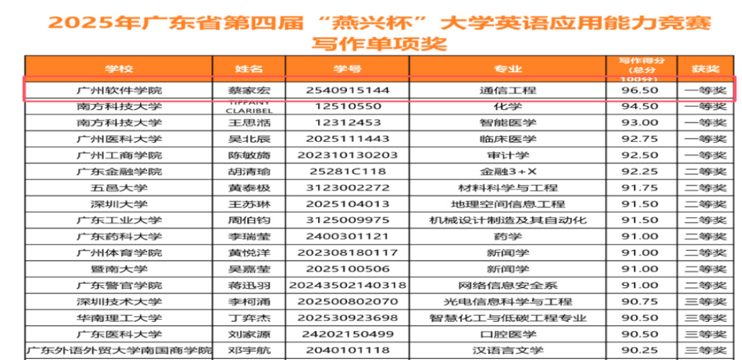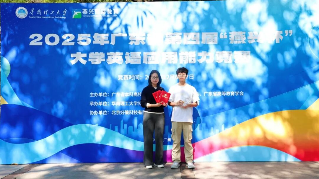 12月6日至7日,由广东省本科高校大学英语课程教学指导委员会、广东省高等教育学会主办的第四届“燕兴杯”大学英语应用能力竞赛复赛及决赛在华南理工大学顺利举行。我校学子表现优异,再创佳绩,其中电子信息与控制工程学院2025级通信工程专业蔡家宏同学荣获全省决赛特等奖,并一举夺得阅读、写作两项专项一等奖及口语专项三等奖;软件与人工智能学院2024级数据科学与大数据技术专业冯灏贤同学获得省复赛优秀奖。