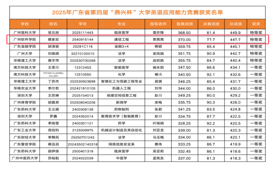 本届赛事由广东省本科高校大学英语课程教学指导委员会、广东省高等教育学会主办,吸引全省72所高校(含广东外语外贸大学、中山大学等省内重点高校)、50669名学生参与初赛选拔,经层层角逐,数千名选手晋级复赛环节。我校报名参赛人数达621人,蔡家宏、冯灏贤两位同学以195分(满分200分)的初赛成绩获校级特等奖,晋级省复赛。在复赛中,蔡家宏同学以第一名的成绩挺进决赛,最终以决赛第二名、总成绩447.7分的优异表现,斩获特等奖。这也是本届赛事中全省唯一获此殊荣的民办高校,实现了我校在该项竞赛中的历史性突破。