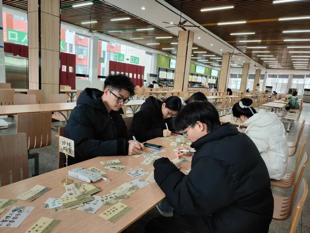 活动现场,艺术设计学院白沙硬笔社的同学们充分发挥专业特长,将食堂从单一的功能性场所转变为浸润人心的文化传播空间。通过“吃光的人面子有光”“碗净福至”“可以废寝不能忘‘食’”“队伍排得齐,好运跟着你”等充满青春气息的趣味标语,将节约粮食、有序排队等理念融入隶书、行书、楷书等多种书法字体创作之中,部分作品还搭配生动有趣的插画,让每一幅标语既是文明提醒,也是文化作品,推动校园文明理念真正从“墙上”走进“心里”。