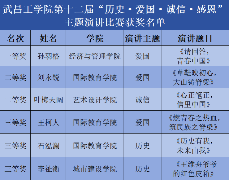 本网讯(通讯员 文毅 史莉洁)12月11日晚,由马克思主义学院、校团委和学工处联合主办,校演讲与口才协会协办的武昌工学院第十二届“历史·爱国·诚信·感恩”主题演讲比赛决赛在图书馆学术报告厅举行。