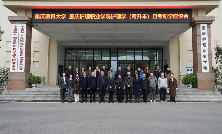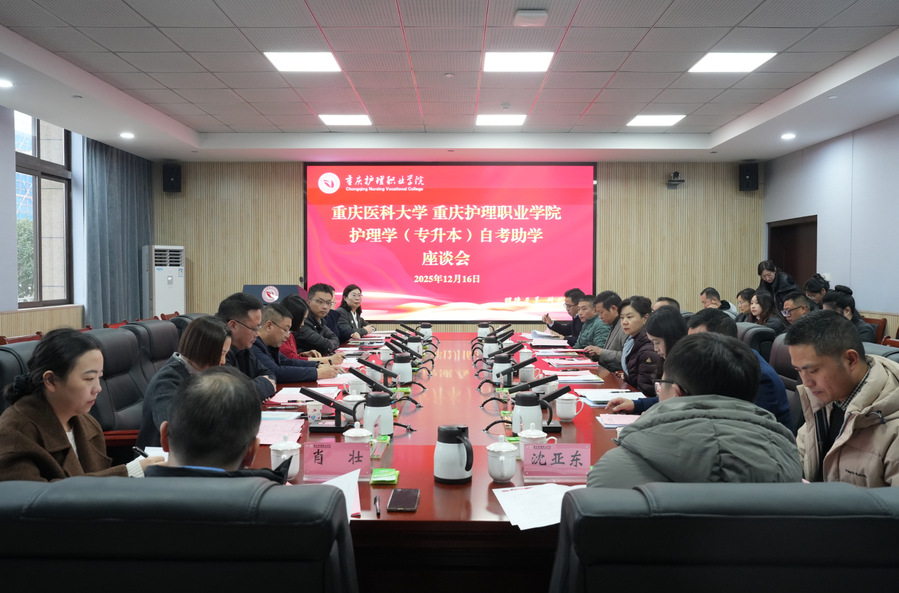 12月16日,由重庆医科大学、重庆护理职业学院主办的“护理学(专升本)自考助学座谈会”在明德楼115会议室顺利举行。重庆市教育考试院自学考试处、重庆医科大学继续教育学院领导与我校在内的十余所高校领导、护理专业相关院系负责人开展座谈。