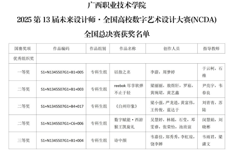 经过校级赛、资格赛、省级初赛、省级决赛及全国总决赛的多轮激烈比拼,广西职业技术学院传媒学师生脱颖而出,数字媒体艺术设计专业于云柯老师指导的作品《以指之名》荣获一等奖,同时,传媒学院师生荣获二等奖3项,三等奖1项。传媒学院学生通过扎实的基础,精良的技艺和天马行空的创造力给本次比赛交上了满意的答卷。