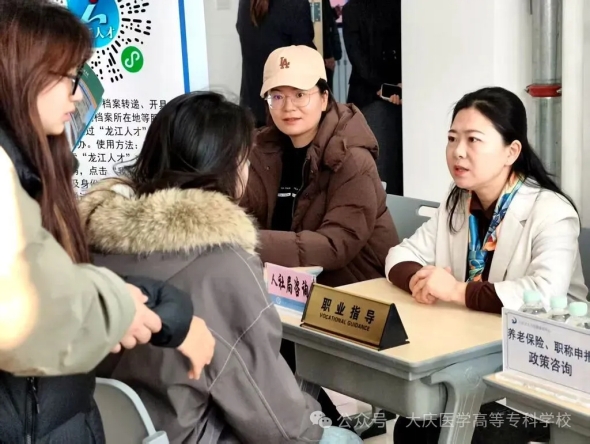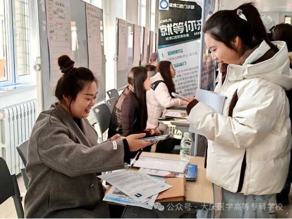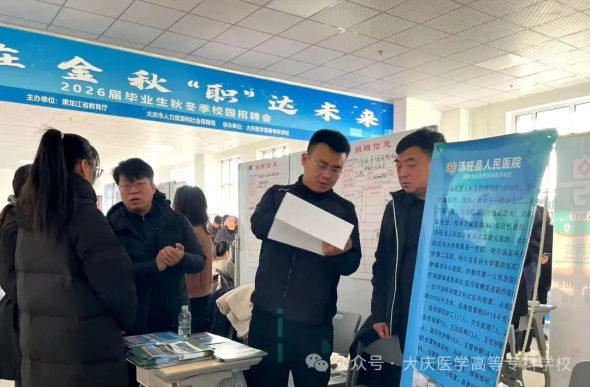 招聘会吸引来自省内外近百家用人单位参会,提供岗位千余个,涵盖医疗卫生、健康管理、生物制药、教育服务、新媒体运营等多个领域,为我校2026届毕业生提供了多层次、多元化、全方位的就业选择。招聘会特别联合大庆市人社局设立政策咨询与职业指导专区,大庆市人力资源服务中心工作人员走进招聘会,现场解读政策、答疑解惑,为我校毕业生精准定位职业选择保驾护航。